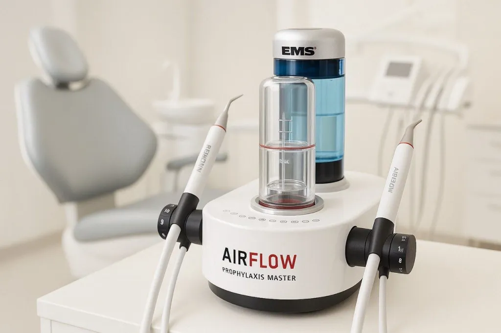 Es un método moderno de higiene sin contacto, en el que la placa blanda y la pigmentación se eliminan suavemente mediante un chorro a presión de agua, aire y un polvo fino especial. El chorro penetra fácilmente en los lugares de más difícil acceso, los espacios interdentales y las bolsas periodontales, donde un cepillo normal no llega físicamente. El procedimiento borra eficazmente las «huellas del estilo de vida» —las manchas oscuras de té, café, vino y tabaco—, haciendo que la sonrisa se vea al instante más clara y fresca. La técnica es absolutamente segura y cómoda para el paciente: no daña las encías ni raya el esmalte, dejando una sensación de suavidad ideal en los dientes.
